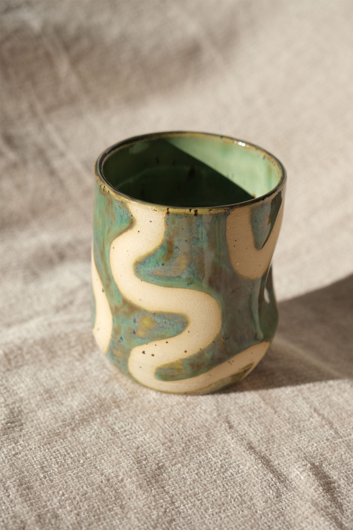 Featuring an MJM Ceramics signature swirl pattern with a unique iridescent green exterior glaze that looks extra special the more you look at it. The swirl shows the natural speckled clay underneath. The interior is a green runny speckled glaze.
